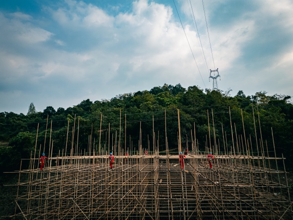 离组塔现场的不远处,另一支施工队伍正紧锣密鼓开展跨10千伏胜波线波金支线的架网防护。为杜绝施工期间工具、导线意外触碰下方带电线路,工作人员先搭建稳固的脚手架,再铺设绝缘防护网,构建起全方位的安全隔离屏障。“10千伏线路安全距离要求严格,架网作业是保障施工安全和电网稳定的关键。”现场安全监护人员表示,山区作业受风力、视线影响大,施工团队严格按照规程操作,确保每一道防护措施落实到位。