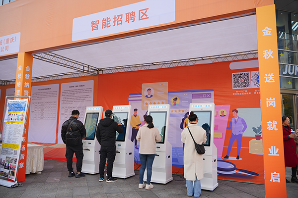 招聘会现场,求职者们手持简历,仔细浏览招聘信息,并在心仪的企业展位前与招聘负责人深入交流,详细了解岗位职责、薪资待遇及职业发展路径。现场还设置多台自助求职机帮助求职者快速完成简历投递,“线上+线下”搭建求职通道。
