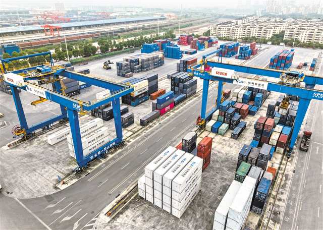12月8日,位于沙坪坝区的陆海新通道重庆无水港内,来自全球的集装箱正在装车。