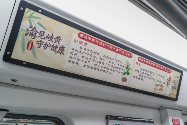 走进专列车厢,浓郁的中医药文化氛围扑面而来。扶手、车厢壁等醒目位置,通过图文并茂的形式精心呈现重庆道地药材“渝十味”、国家级传统医药类非遗项目、古代名医典故、节气养生常识、巴渝特色药膳食谱及经典养生疗法等内容,系统展现巴渝中医药文化的独特魅力。为增强互动体验,车厢内还设置了专属二维码,乘客扫描后即可聆听中医药科普专栏,实现从“视觉阅读”到“视听沉浸”的立体体验升级,让专业的中医药知识以更通俗、更生动的方式触达群众。