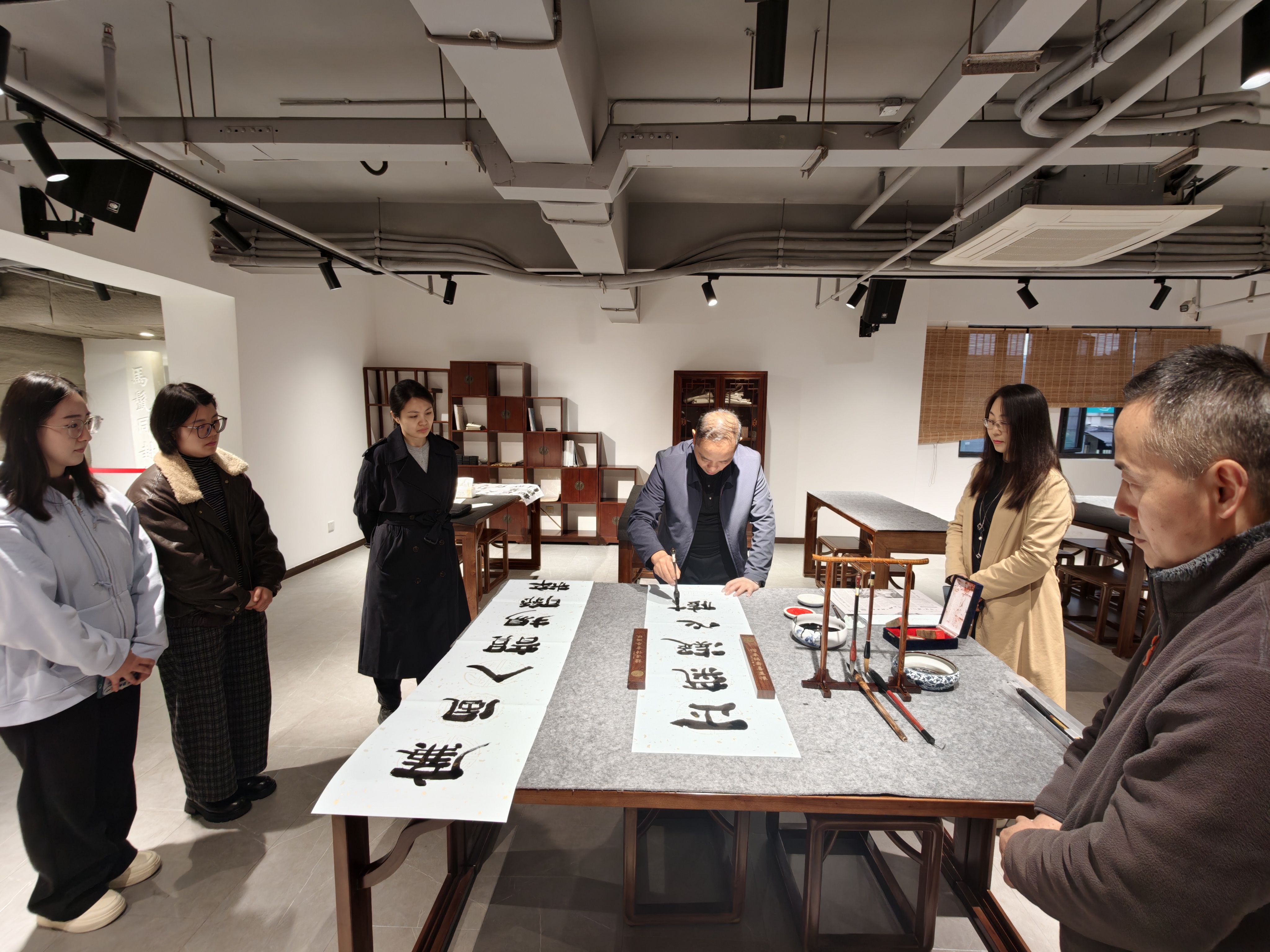 重庆市非物质文化遗产保护中心主任牟元义调研非遗文化时现场创作书写廉洁楹联。