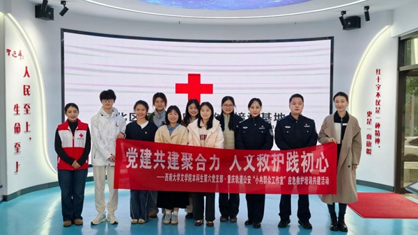 近日,重庆市公安局轨道交通分局“小冉群众工作室”联合西南大学文学院党支部,在两江新区红十字应急救护培训基地开展以“应急救护培训”为主题的党建共建活动,以专业应急培训深化“警、校、地”协作,构建“青春救护共同体”,切实提升高校师生出行安全防护与应急自救互救能力。