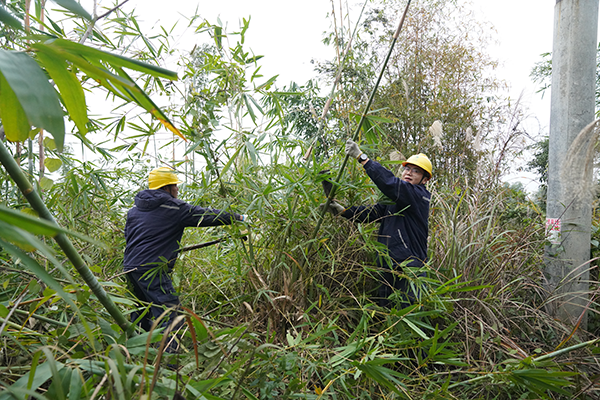 国网重庆铜梁供电公司员工根据新型卫星遥感技术评估结果在10千伏虎泉线罗家湾支线精准开展树竹清障工作。