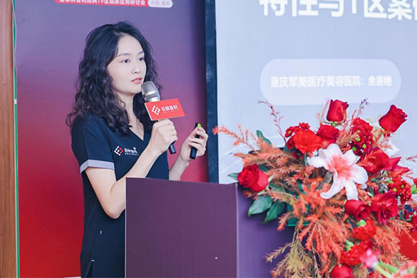 在学术分享环节中,重庆军美医疗美容医院微整科技术院长余恩艳分享《菲林普利CaHA材料特性与T区案例分享》的专题内容。从材料科学基础出发,系统阐述了菲林普利(CaHA)的作用机理,并结合临床影像资料,分享了该材料在面部T区精细化塑形中的操作心得与美学考量。