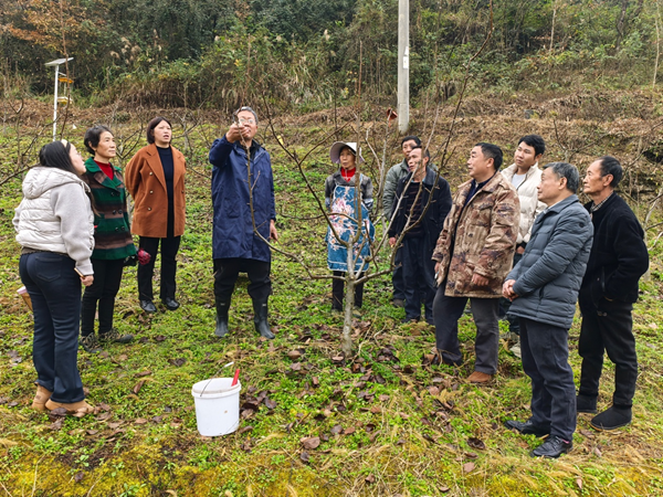 杨永霞邀请市农科院果树专家针对果树冬季修剪技术进行专业授课与实操指导。酉阳县公安局供图
