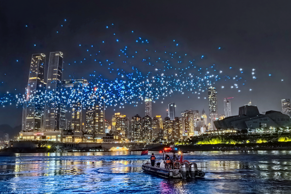 重庆水上公安分局民警在两江交汇水域无人机灯光秀表演现场值守。重庆水上公安分局 供图