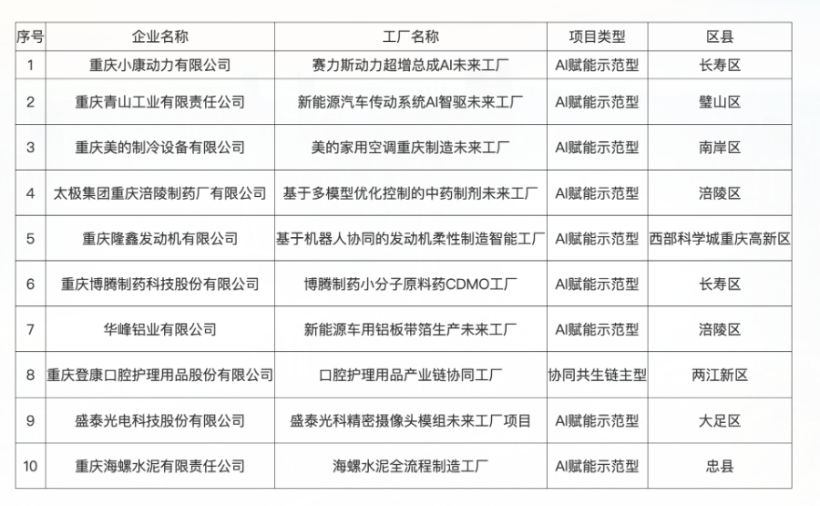 12月26日,记者从重庆市经济信息委获悉,经企业自愿申报、区县经信部门初审、专家评审等程序,拟确定10家工厂为2025年重庆市未来工厂。