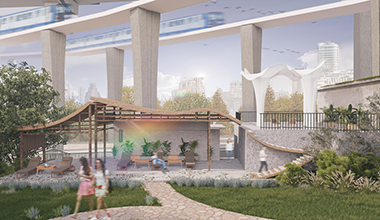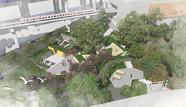 以“桥畔·城市窗——文脉与功能的共生枢纽”为核心,紧扣“创意再生街角城市橱窗+生活枢纽”的定位,将轨道桥下空间从“灰色闲置区” 转化为“有温度的文化展示窗口”。