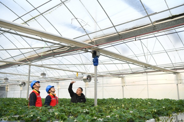 洛碛供电所工作人员检查大棚内电机运行状况。(冯胜岚 摄)