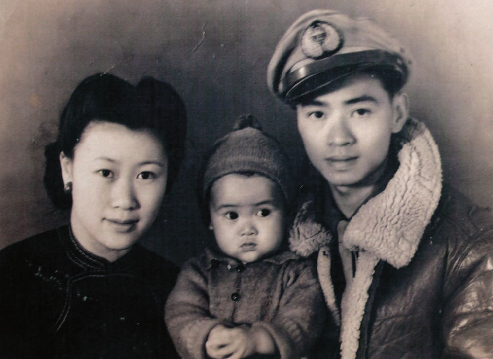 龙启明夫妇和大儿子龙文伟在1945年8月15日的合影(资料照片) 新华社发