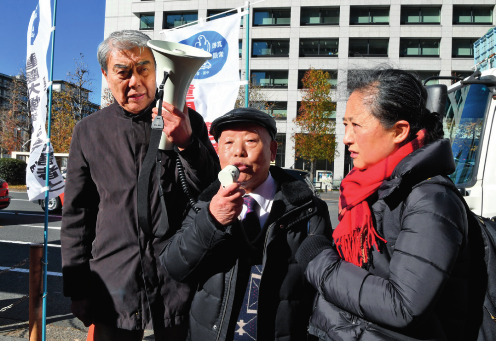 在日本东京高等法院外,“重庆大轰炸”受害者民间对日 索赔原告团团长粟远奎(中)抗议不公正判决(资料照片) 马平摄 / 本刊
