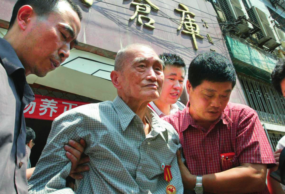 抗日老兵杨养正(左二),从重庆重返当年的老战场——上海 市苏州河畔的四行仓库(资料照片) 陈飞摄 / 本刊