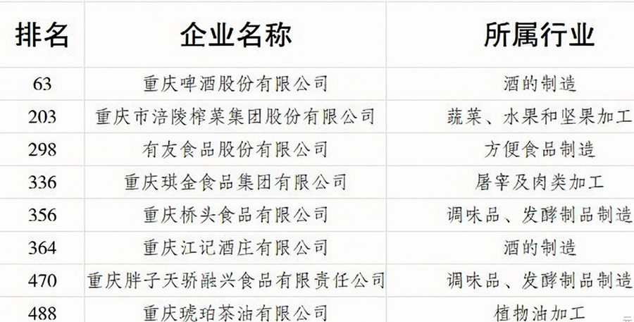 日前,重庆啤酒、涪陵榨菜等8家食品类渝企上榜“2025年度全国食品工业500强”,展现出“渝味食品”在消费市场的强劲竞争力。