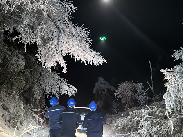 国网重庆巫溪供电公司员工通过无人机对110千伏河白西线融冰情况进行观察。(郑航 摄)