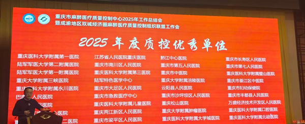 近日,重庆市麻醉医疗质量控制中心2025年工作总结会暨成渝地区双城经济圈麻醉医疗质量控制组织联盟工作会召开,重庆松山医院麻醉科因其医疗质量控制与专业服务水平,获“2025年度质控优秀单位”称号。