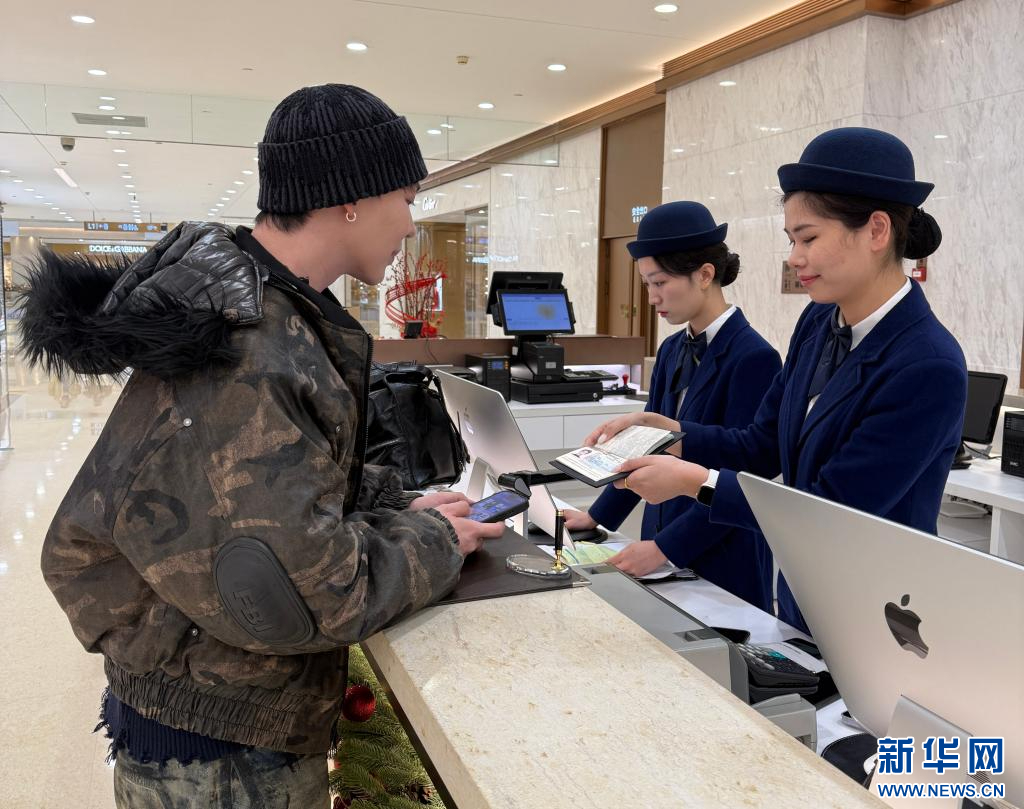 在重庆观音桥商圈离境退税集中退付点,工作人员为来自越南的游客现场办理退税。新华网发服务加力助推高水平对外开放