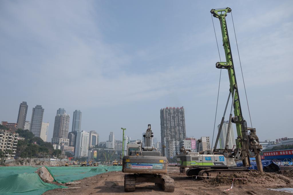 2月11日,大型设备在重庆站项目施工现场作业。新华社记者 陈诚 摄
