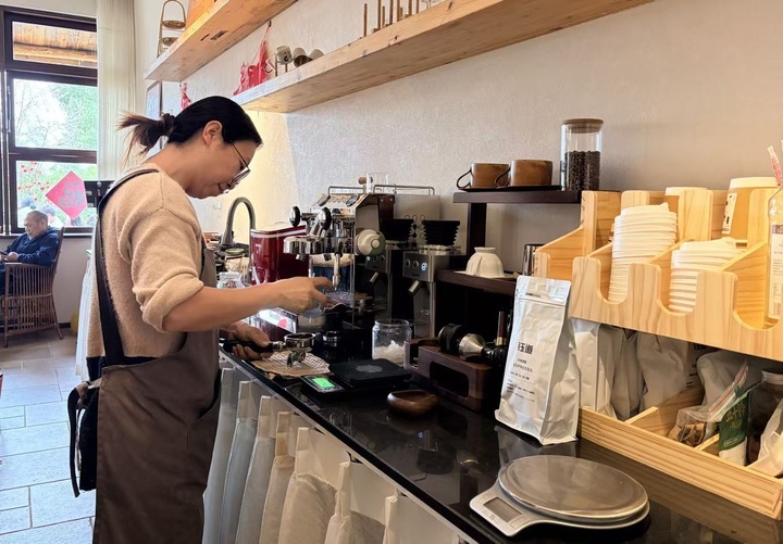 重庆北碚钰道民宿,张利娜正在手冲咖啡。新华社记者 赵小帅 摄