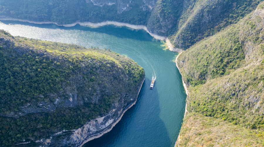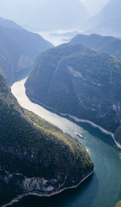 一艘游船从巫山县城方向驶来,在碧绿的江面上划出白色尾流,从巨大的“鱼嘴”旁轻盈穿过。一动一静,相映成趣,仿佛正从鱼头湾“游”进春天里。熊威摄