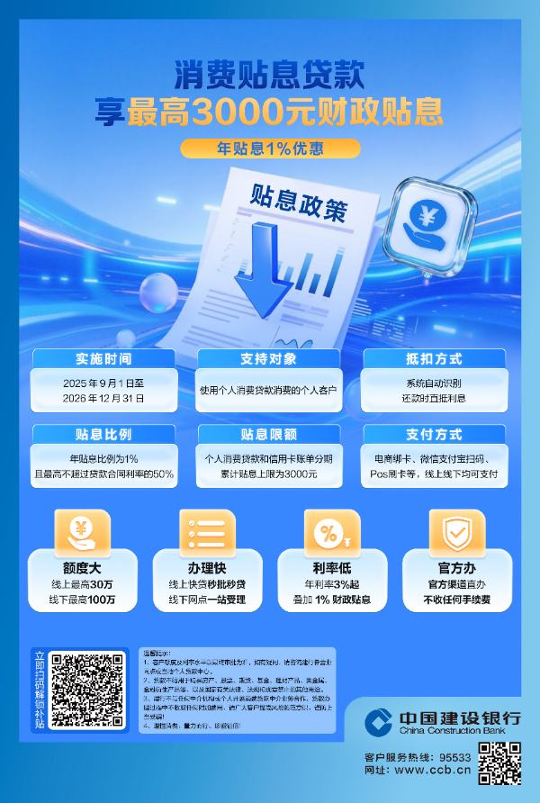 中国建设银行:消费贴息贷款享最高3000元财政贴息