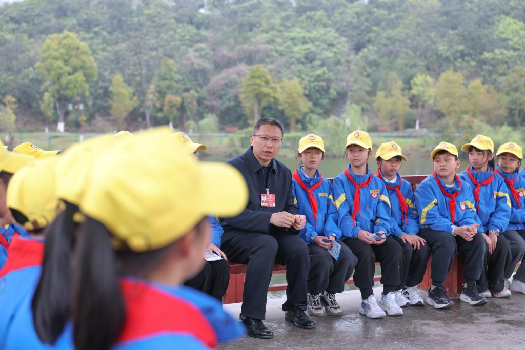 3月20日,在重庆永川区神女湖边,全国人大代表傅国涛向参加“世界水日”“中国水周”科普实践体验活动的红河小学“小黄帽”志愿服务队的同学分享生态环境法典与日常生活的关系。