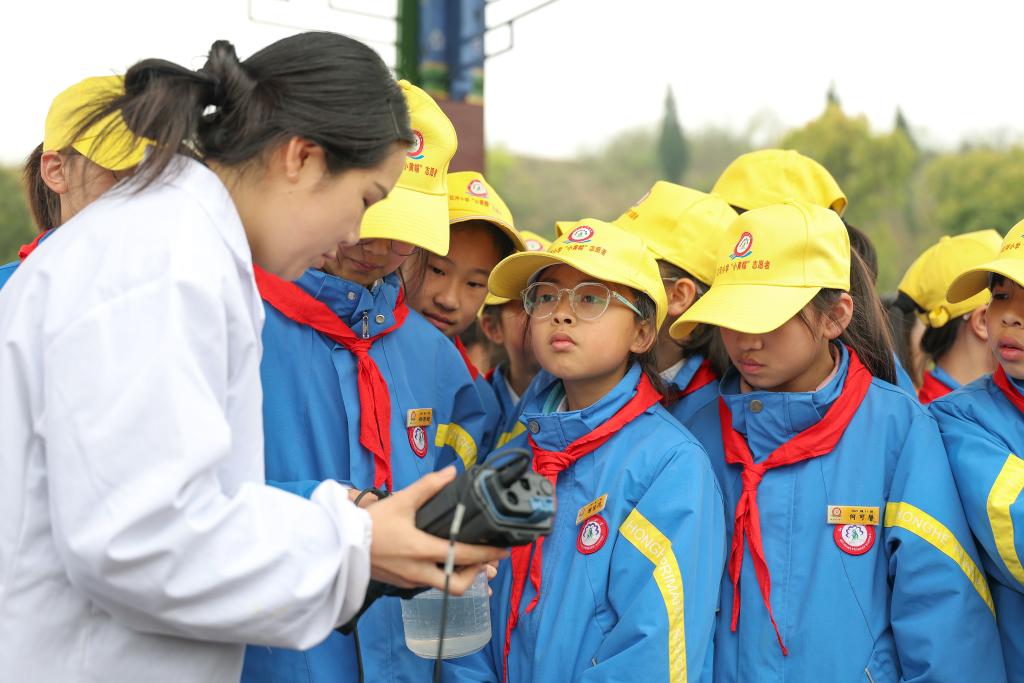 3月20日,在重庆市永川区神女湖边,工作人员现场教红河小学“小黄帽”志愿服务队的同学体验水质检测流程。