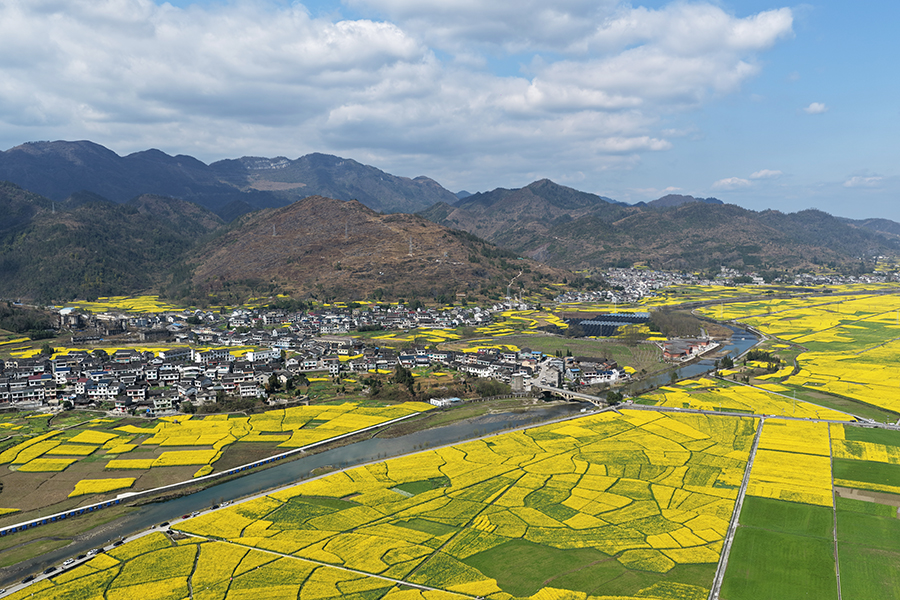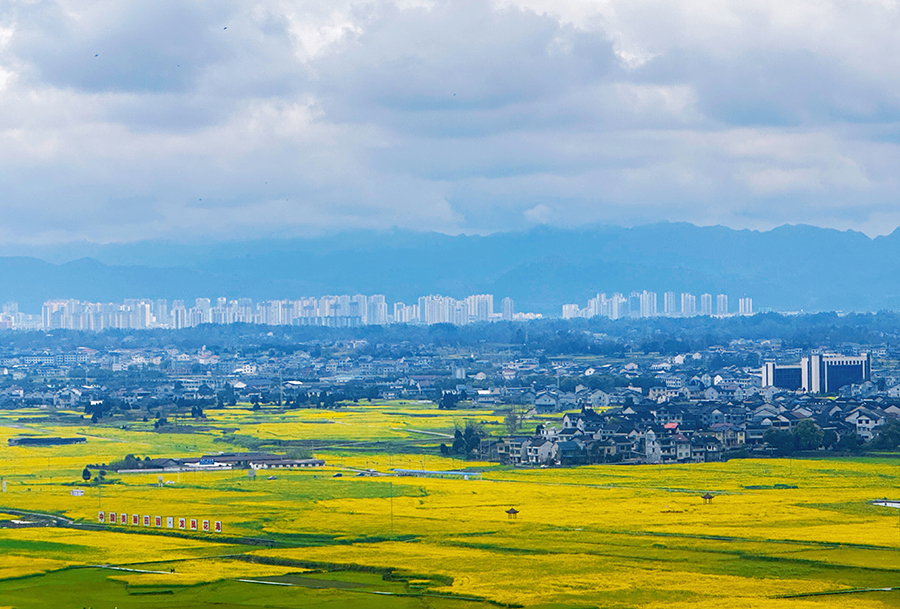 新华网重庆3月25日电(李海岚)远山含黛、楼宇错落、民居点缀、万亩油菜花田次第绽放……这是3月24日重庆秀山县清溪场街道万亩粮油示范基地的春日盛景。近年来,秀山县深耕高标准农田建设,盘活土地资源、植入科技动能、融合农旅业态,一幅粮满仓、民增收、景如画的乡村振兴画卷正徐徐展开。