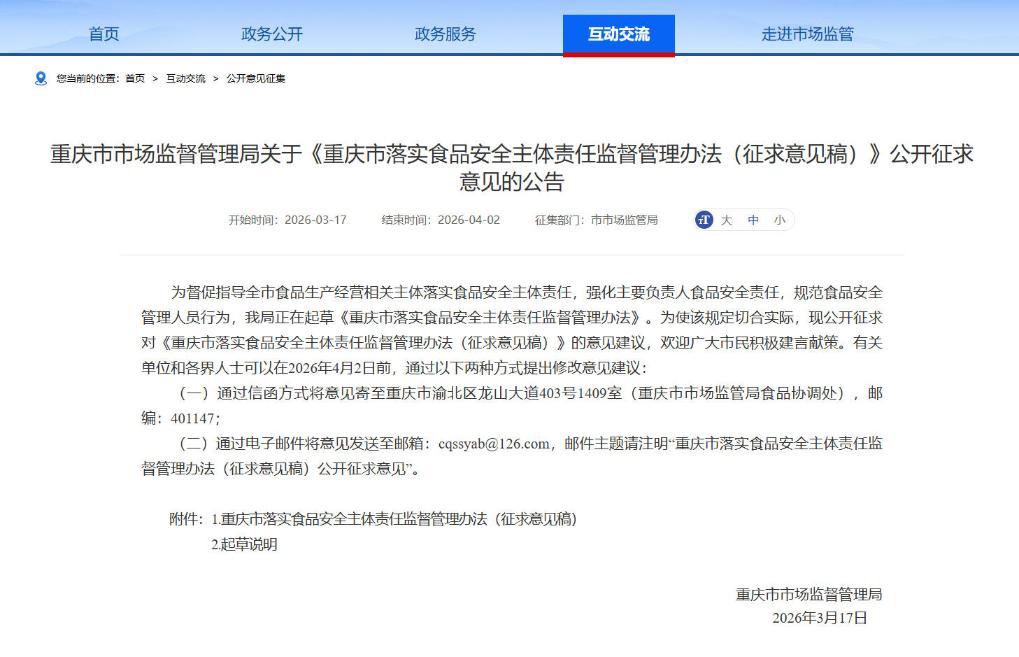 为进一步梳理、细化、规范各类食品生产经营主体的食品安全主体责任制要求,持续推动食品安全风险防线前移,不断提升食品安全管控质效,近日,重庆市市场监督管理局起草了《重庆市落实食品安全主体责任监督管理办法(征求意见稿)》(以下简称《办法》),现向社会公开征求意见建议。