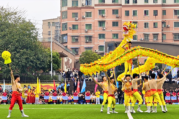 会议当天,铜梁一中的操场上正热闹非凡。铜梁区第十九届青少年体育节暨第十二届校园足球联赛正在绿茵场上开启。一群孩子正展示了龙舞《在希望的田野上》,金色的巨龙在阳光下翻腾,孩子们的脸庞红扑扑的,神采飞扬。