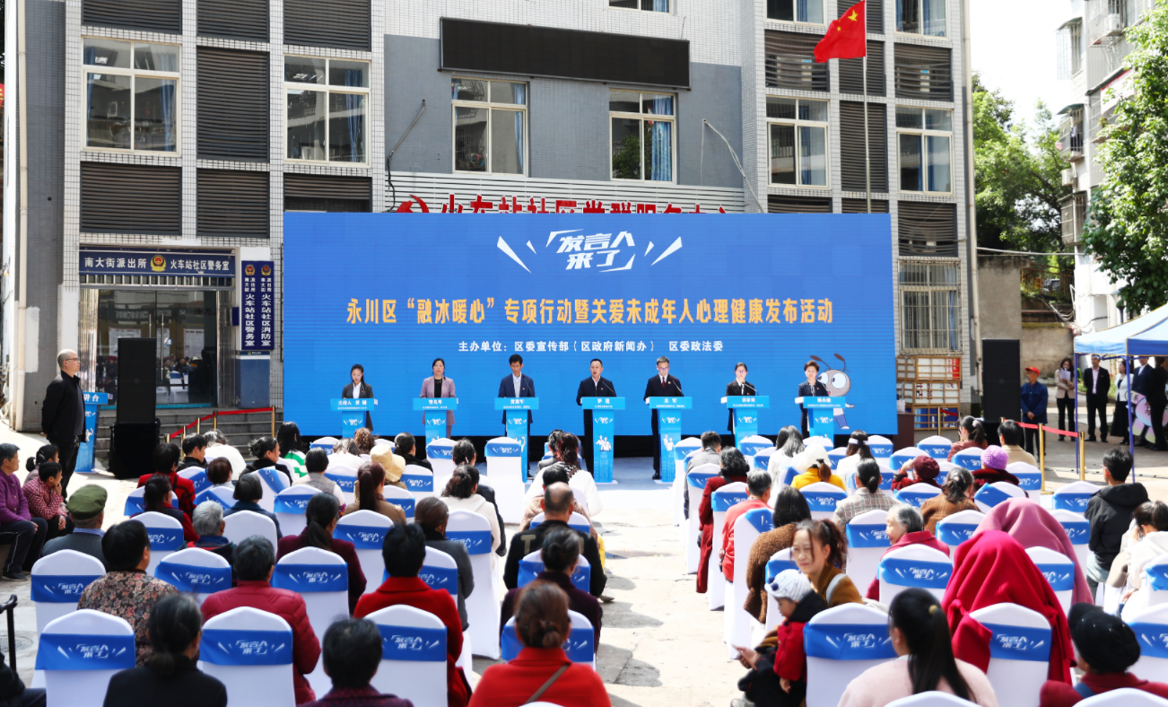 3月31日下午,发言人来了——永川区“融冰暖心”专项行动暨关爱未成年人心理健康发布活动在永川区火车站社区党群服务中心院坝举行。