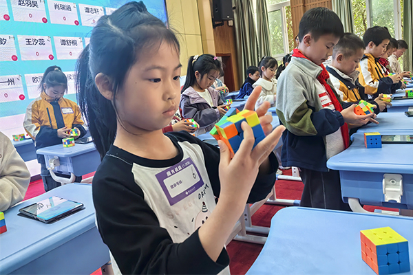 魔方比赛分低段与中高段两个场次进行。赛前15秒的观察时间里,孩子们凝神静气,在脑海中预演每一步转动。比赛开始,魔方在掌心飞速旋转,色块快速归位。七巧板赛场上,一、二年级的小选手手持七块板,在规定时间内自选图形进行拼搭;数字华容道赛场上,选手们推动数字滑块在有限空间内腾挪移动;数独赛中低、中、高三个组别选手面对各类数独题目,静心推理,致力60分钟内从“数字迷宫”中完成挑战……现场,同学们指尖竞速、巧手拼摆、逻辑缜密、步步为营,让人看得热血沸腾,这不仅是速度与准确的双重较量,更是创意与耐心的趣味碰撞及全盘谋划的策略考验。