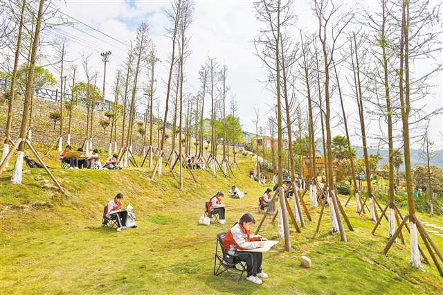 行走在藤子沟水库周边的步道上可以看到,远处,一排排精品民宿在明媚春光中林立;近处,三三两两的学生手扶画板,在湖畔边、草坪上、凉亭中潜心创作。
