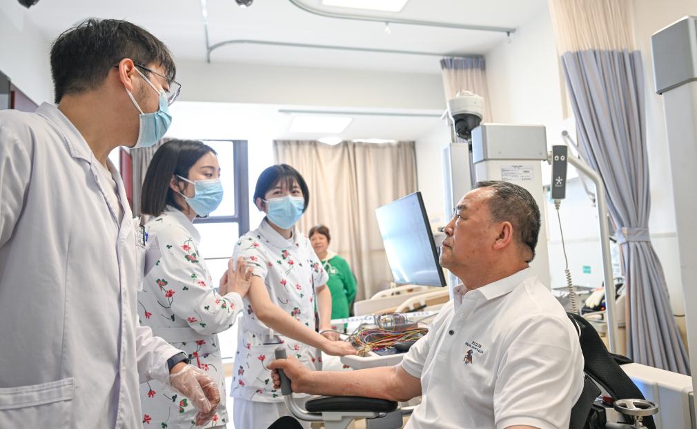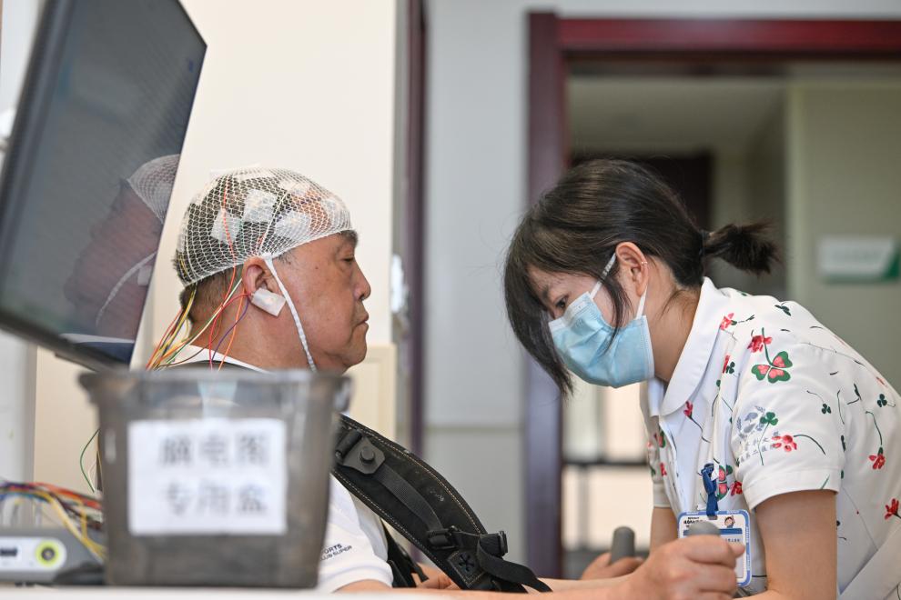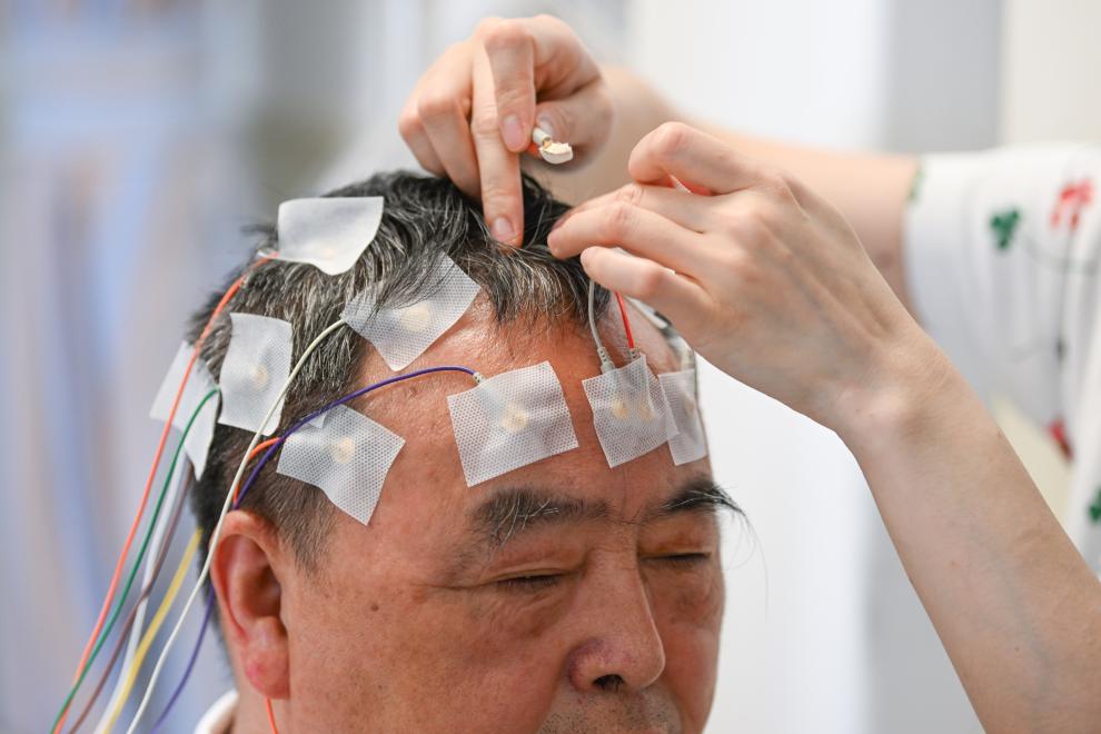 4月10日,医护人员为李清东穿戴无创脑机接口采集设备。新华社记者 陈诚 摄