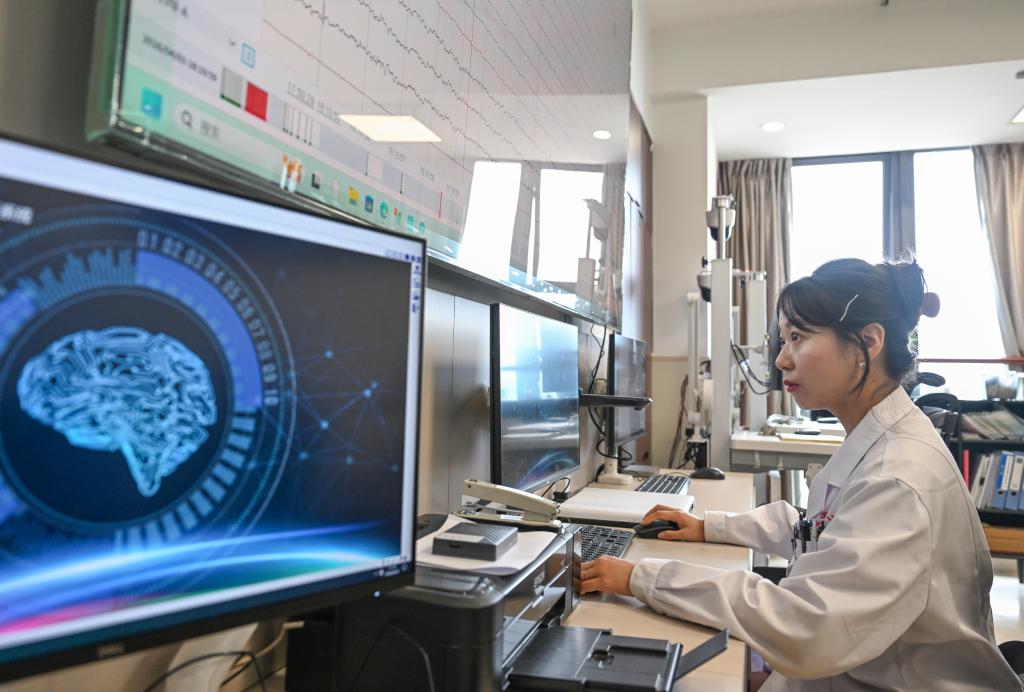 4月10日,逯菀婷医生在电脑前查看患者的脑电图数据。新华社记者 陈诚 摄