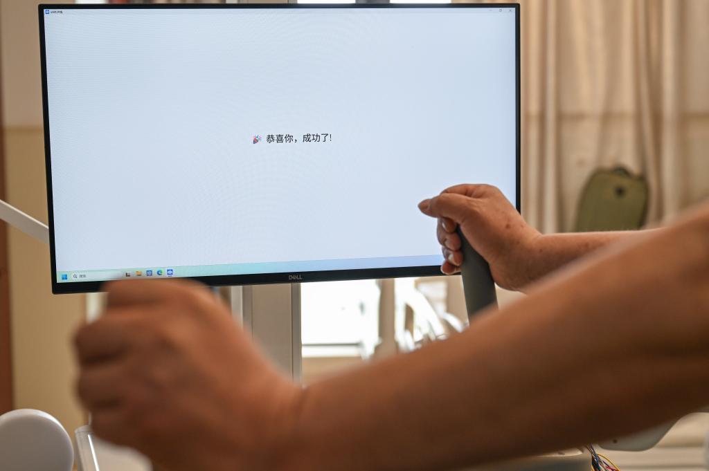 4月10日,无创脑机接口采集设备显示患者“意念控制”成功。新华社记者 陈诚 摄