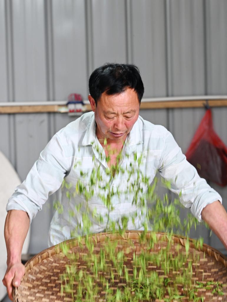 4月11日,茶农在重庆市永川区廖云祥茶树种植基地制作茶叶。新华社记者 王全超 摄