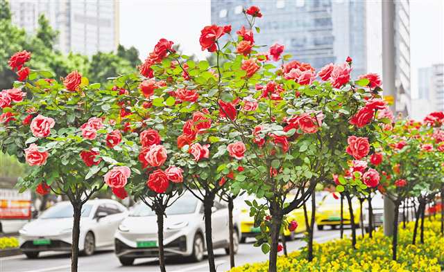 两江新区建新北路,树状月季开得正艳(摄于四月七日)。记者 张锦辉 摄\视觉重庆