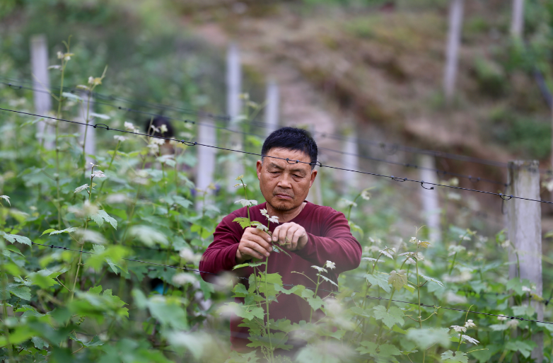 近日,在重庆涪陵美心红酒小镇的千亩生态葡萄园里,村民们正抢抓晴好天气,开展修枝、掐尖等春季管护作业,为葡萄全年长势与丰产丰收筑牢基础。
