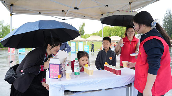 4月11日,双桂湖国家湿地公园,家长与孩子在挑战“吹响国安哨”趣味游戏。
