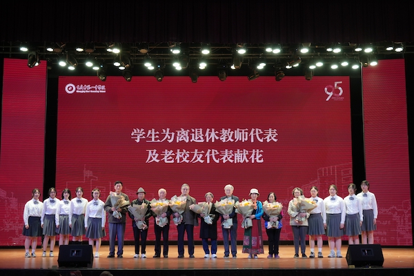 在“风范长存”环节,校领导向历任校长代表及校长亲属代表献上鲜花,学生代表为离退休教师代表及老校友代表献上鲜花。一束束鲜花既表达了对前辈们的敬意,也是教育薪火代代相传的生动象征。活动最后,全场齐唱青春版校歌,歌声在礼堂内久久回荡。