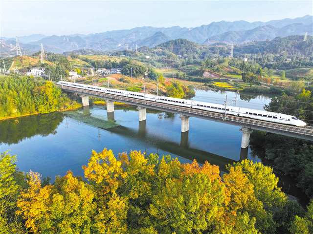 梁平区双桂湖国家湿地公园,郑渝高铁列车快速驶过。(本报资料图片)