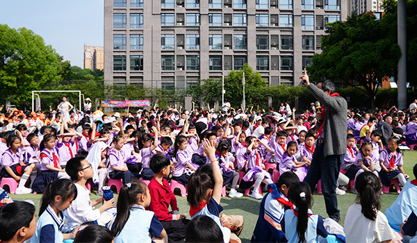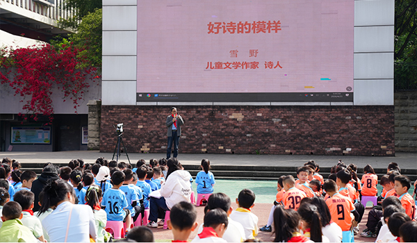 4月23日世界读书日当天,学校将活动推向高潮。儿童文学作家、诗人雪野走进校园,在操场上举行“文学浸万家·作家进校行”专场活动。活动伊始,校长衡永芹在致辞中回顾了学校“阅读悦美”课程的建设成果,并寄语孩子们:阅读不止于写作,希望他们在每一个平凡的日子里,都能拥有感知美好的能力。