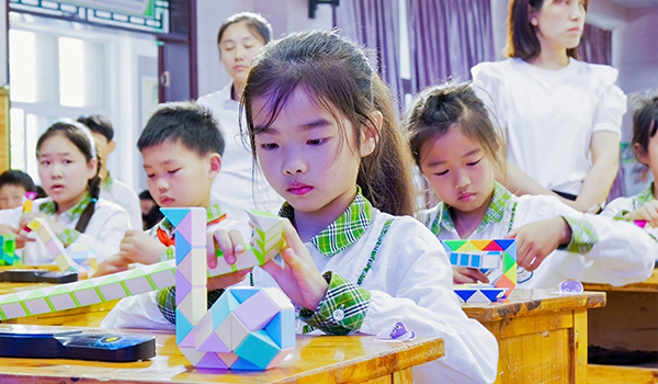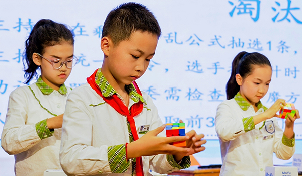与游园活动同步进行的“趣味数学竞赛”,则是另一场思维与速度的较量。竞赛采取全员参与、层层选拔的形式,为每一位学生提供了展示逻辑思维与创新能力的舞台。各年级竞赛项目特色鲜明:一年级的“变脸魔方”考验观察与空间感知;二年级的“七巧板”在方寸之间释放图形创造力;三年级的“百变魔尺”指尖翻转,构筑立体想象;四年级的“数字华容道”在有序推演中培养统筹逻辑;五年级的魔方竞速,比拼手眼协调与空间记忆;而六年级的“汉诺塔”挑战,则要求学生恪守规则、步步为营,在最优解法的探索中养成严谨有序的思维品质。此外,各年级还设置了“神机妙‘算’”“‘计’高一筹”“玩转24点”“数独”等速算与逻辑类比赛,一至六年级全体学生同台竞技,现场气氛紧张而热烈。