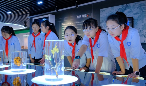 在重庆中医药学院中医药文化馆,学生们一边仔细聆听,一边好奇地观察中药材,对中药材在生活中的广泛应用有了切实认知。