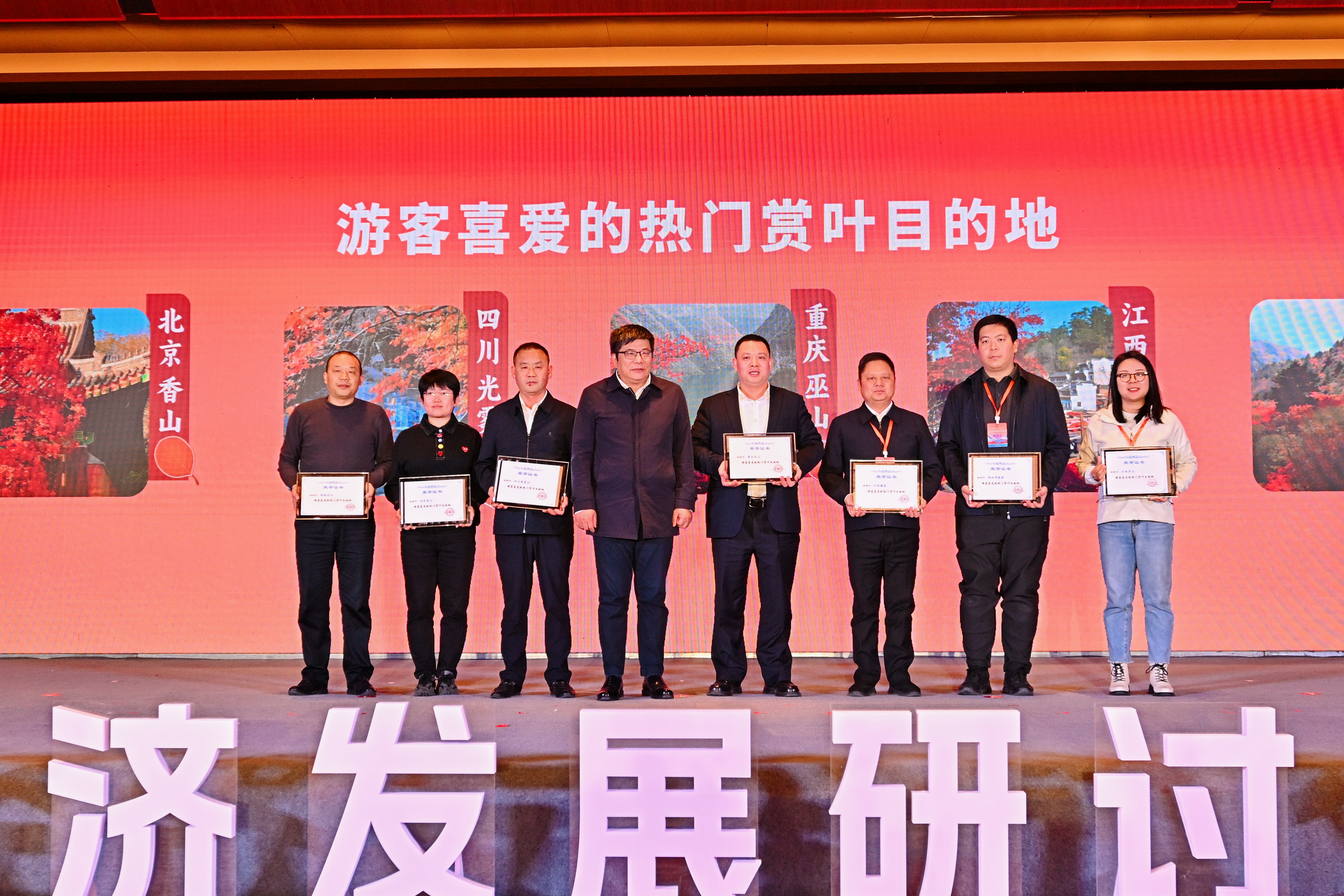 北京香山、江西庐山、湖北神农架、江西婺源、重庆巫山、四川光雾山、安徽宏村景区代表领取《游客喜爱的热门赏叶目的地》证书。