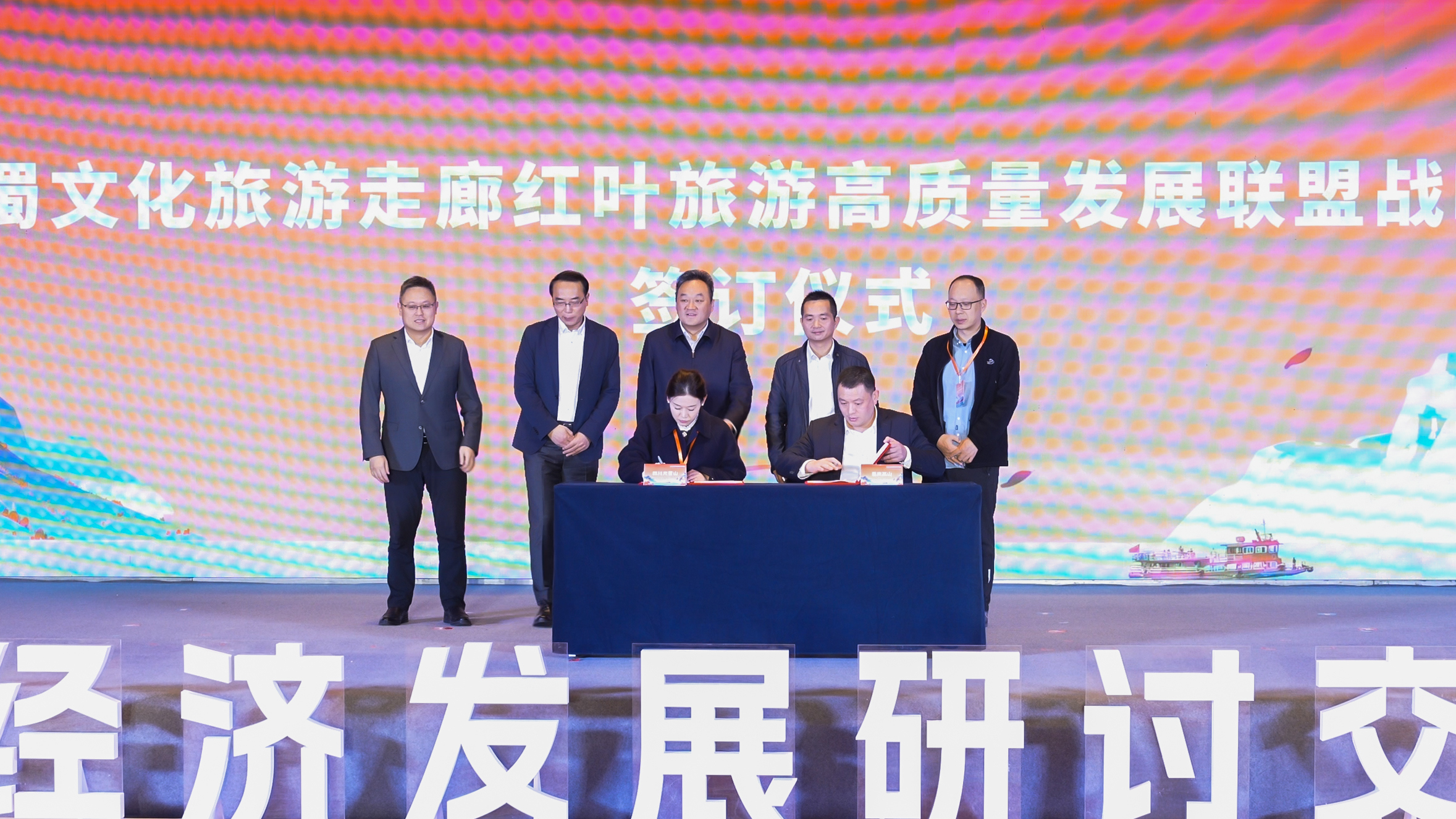 巴蜀文化旅游走廊红叶旅游高质量发展联盟战略合作协议签订,重庆及四川两地红叶景区代表,重庆巫山文旅集团总经理陶举斌、四川巴中文旅集团副总经理伏丽琼签约。