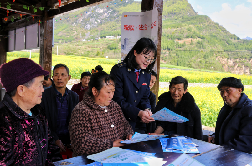 巫溪县税务局组织人员走进白鹿镇下坝村油菜花景区,设立咨询台,用“家常话”为村民讲解社保缴费流程,并针对周边农家乐、小摊贩等个体工商户,详细解读纳税申报、发票开具等热点问题。