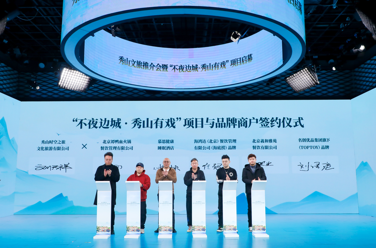 主持人:最后进行的是,“不夜边城 秀山有戏”项目与品牌商户签约仪式。有请——秀山时空之旅文化旅游有限公司总经理刘天祥,北京谭鸭血火锅餐饮管理有限公司副经理任超,慕思健康睡眠酒店 拓展部部长刘语亮,海鸿达(北京)餐饮管理有限公司(海底捞)品牌市场部副总经理何雨,北京羲和雅苑餐饮有限公司开发副总经理孙博林,名创优品集团旗下(TOPTOY)拓展总监孙望尘上台签约。