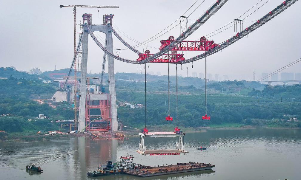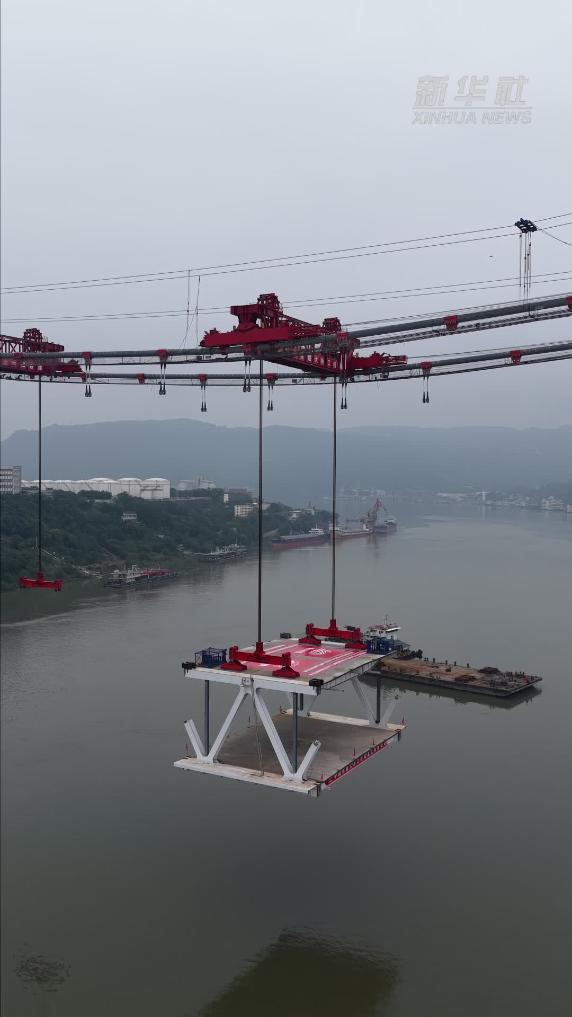 世界在建最大跨径公轨两用悬索桥完成首节钢桁梁吊装