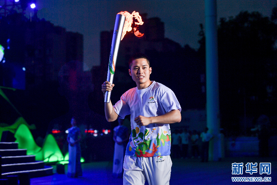 合川籍拳击运动员、国家级运动健将、重庆市五运会拳击冠军高灿将圣火带入会场。新华网发
